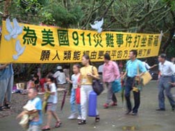 [Formosa] Upon receiving Master's phone calls, fellow practitioners in Formosa immediately launched a relief activity entitled "Send Our Love to New York." In addition to contributing financial aid to the victims, all centers held several prayer and group meditation sessions. Fellow practitioners who could not attend the group meditation sessions were requested to meditate at home from seven to ten each evening. It was hoped that the focused spiritual power of group meditation could dissolve the negative atmosphere and animosity produced by the attacks, and send God's indiscriminate love to those who had caused the catastrophes and to others in need of love and blessing, so that they will feel the light and love deep in their souls, and refrain from committing further acts that hurt themselves and others. The Chung Hsiao East Road Center and the Sungshan Bookshop of the Taipei Center were opened for fellow practitioners to come in and meditate and pray. Every Wednesday and Friday evening, prayer and meditation sessions were attended by thousands of people at these venues. In support of the "Send Our Love to New York" activity, fellow initiates at National Taiwan University coordinated their efforts with peace-loving friends on and off campus to disseminate "love cards" at their welcoming party for new members on September 14. Participants were invited to write their wishes on the love cards and tie them to balloons. At noon, the activity reached a climax after a three-minute silent prayer, when the balloons symbolizing peace doves and loaded with countless loving wishes for the 911 disaster victims were released into the blue sky. The Society for Body and Mind Development, established by fellow initiates at National Taiwan Normal University, also held a series of prayer activities for the 911 disaster victims during their welcome party for new members on the morning of September 18.