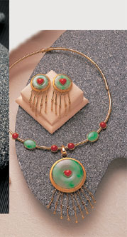 M: The first aim is to remind people of the beauty from Heaven. That's why each design has a name of its own. The general name is Celestial Jewelry, and each design has a very spiritual name such as "To the Other Shore", or "Liberation", or "Wisdom Eye", or "The Future Buddha", or "Meditating Quan Yin", or "Bodhidharma", or "God's Child", or "Little Angel" and so on. All these are noble names from Heaven to remind us of our own Nature within. And the second aim is to earn some money for myself so I don't have to rely on my disciples because I never take donations. Of course, the jewelry, fashions and paintings earn a lot of money. And this money I want to give to people who are in disasters or in need, like in poverty or an emergency. J1: How much time do You need or take to create? M: Each piece is different. Some take longer; some take shorter. The longest would be about a week, and the shortest perhaps a day or even half an hour; it depends. Sometimes I'm very inspired: In one day, I can make about ten or twenty designs or in one night perhaps thirty clothing designs. At those times I don't sleep all night. I work from dusk until the next dawn. J1: We know that You're very busy. How do You find time to do that? M: Because as I said, sometimes I'm inspired. I can work the whole night and whole day and then finish one section very fast. And I just do it when I have time. If you want to do something, you'll find the time for it. J1: Is the artistic inspiration contagious to Your disciples; do they become artists, too? M: Yes! Some of them also suddenly become artists overnight. And they suddenly write poetry, or suddenly know how to paint or design their own clothes. That's very good. It's not really "contagious"; it's just the meditation that brings out the best in people in time. J1: Do You happen to refer to what other designers do and learn from them? M: No, I didn't do that before. I never had any idea [about doing that]. I just did it from my own creative inspiration. But after I was done creating things in different fields, of course by chance, I would get in touch with many other artists, and sometimes we would exchange ideas. But that came afterwards and was a consequence of my exhibitions or my creative objects. J1: Concerning Your source of inspiration, where do Your visions and colors come from? M: From inside, from inside my brain! Sometimes the colors and pictures come before I can paint them out. So I have to do it fast before I forget. J1: I have one technical question about Your jewelry: I know that inspiration is very important to You, but do You also pay attention to the materials You use such as diamonds and so on? M: Yes, we do pay great attention to details such as the materials. For example, we use the best, most reputable gold and the best stones, and we choose the colors. For example, this (indicating one of the opals in the necklace "The Hidden Force Connection") is a very rare color, and the size is very rare, too. To have a piece so big and so beautiful as this is rare. As for the gold and all the precious and semi-precious stones, we choose the best to represent the flawless Heavenly quality. J2: I would like to know if You give meaning to Your jewelry. For example, if You see a piece of jewelry that You didn't make, would You give it a meaning, even if it's not from You? M: Well, I think that if some other artist creates his or her own piece of jewelry, he or she is the only one who has the right to give meaning to the jewelry. So, I don't interfere with people's creations and their inspirations or their right to their own thinking. I just take it as a piece of art. And if the creator of that piece of jewelry gives a meaning to it, then I accept it. But I wouldn't give my own interpretation to other people's inspirations in jewelry, or any artistic piece. J2: Thank You. M: You're welcome. Are you satisfied? J2: Yes. It's just that I have another question: I want to know if I show You my ring, will You give a meaning to it? M: Did you create it yourself? J2: Oh, no! Not at all. M: Then I don't think I'm allowed to give a meaning to someone else's state of mind. You should ask the creator of this piece to give you the meaning, OK? I think we must respect everyone's private individual inspiration and artistic tendency. I don't always wear the jewelry I've created; I wear anyone's. If I see a nice piece that's suitable for an occasion, I'll sometimes buy it. And sometimes I buy things to give to people. But I don't give meaning to anything like that; I just buy it. J2: I wonder if You would describe and tell us why You're wearing the jewelry collection that You are today? M: (Referring to "The Hidden Force Connection" necklace and earrings Master was wearing) Today it just happened that I wore green, [almost] the same color as the opals so I thought they matched. I normally match everything to create a harmonious look so that when people see me, they'll see the oneness and no contrasting or fighting energy around my body, and so that everything I wear represents peace and harmony within and without. J2: And which materials represent perfection to You, or what's Your preference: Is it diamond, gold or what? M: I think everything that God created, even a piece of a pebble, is perfect in its own way. It's just that in this world we've chosen those rare and shinier stones to represent our inner shining quality. So likewise, I have to choose them; for example, diamonds, opals, rubies and so on. Since the people of the world like them, I can't just give people things that they don't like. I have to create with the things that people already like and are familiar with. The reason people like shiny objects is that somehow in the deepest corner of their hearts, they still remember the shining quality or the Light within. That's why people love diamonds and rubies, not for the material possession of these things but because of the yearning in their souls to go back to the